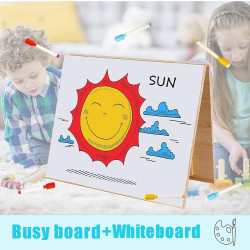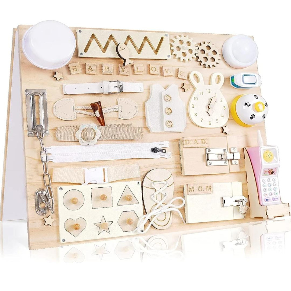 🧮Wooden Latches Board: The best way to entertain and educate your child is a sensory board with puzzles, numbers, etc. Our busy board is also equipped with a drawing board to stimulate children's drawing and cognitive abilities. 🧮Educational Toys: The board is an educational activity toy board that helps children develop flexibility when using hooks, snaps, click and slide latches. 🧮Toddler Travel Toy: Our multifunctional toy is fully assembled and weighs 9 pounds! Baby toys are very suitable for traveling by car or plane, staying at home due to isolation. 🧮Wooden Activity Toy: The surface of the board is made of high-quality wood, and the back has a foldable magnetic drawing board. Every corner is rounded and smoothly polished, so there is no sharp edge that will hurt the child's fingers. 🧮Baby Gift Idea: This beautiful busy board is a great gift for gifted children, babies and toddlers. Make it an unforgettable and surprising birthday, Christmas, New Year, Easter, Thanksgiving.