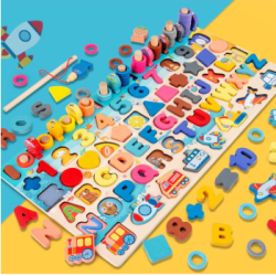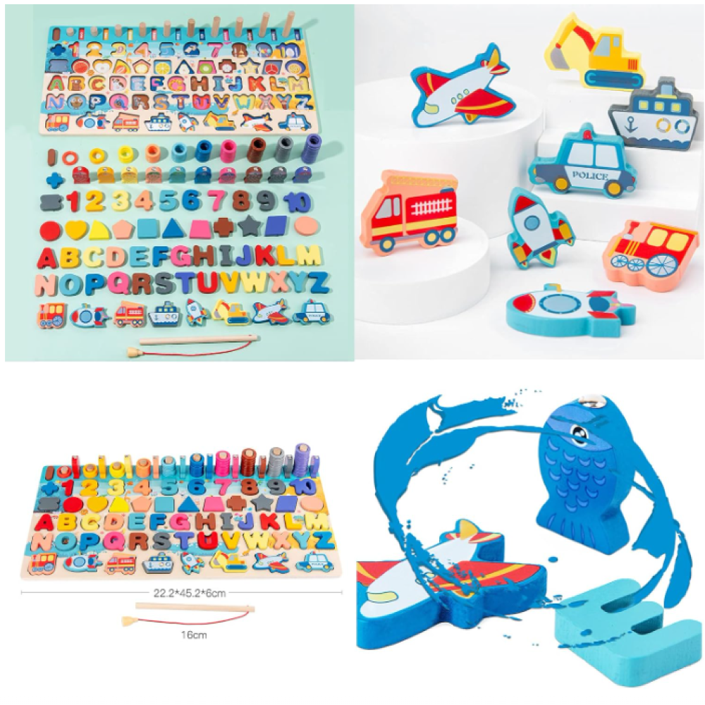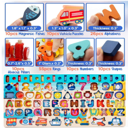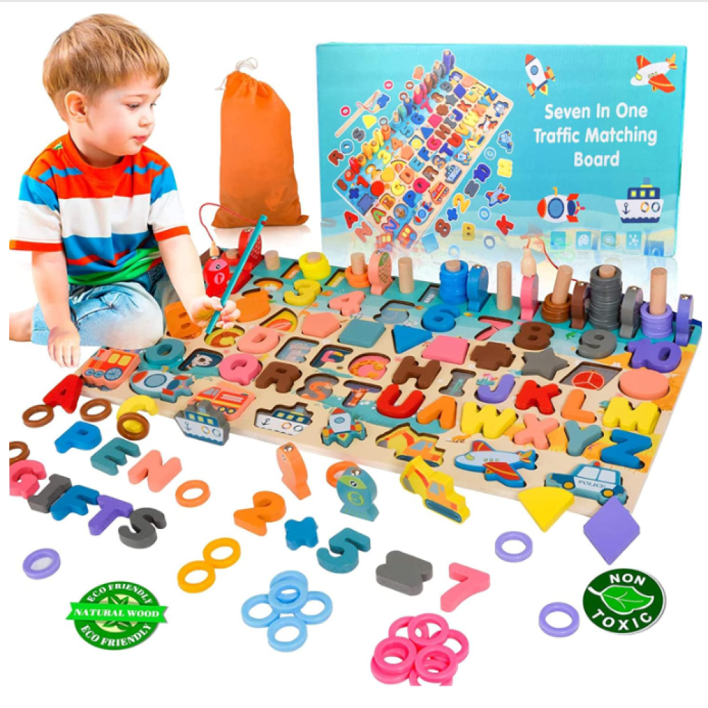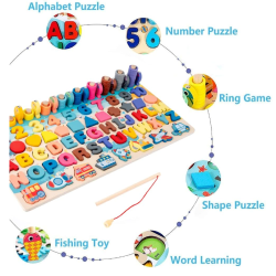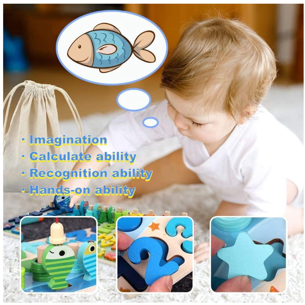 🧮Preschool Educational Toy - Montessori toys are ideal for establishing early color, shape, letter and number recognition for toddlers, these wooden toddler blocks with the perfect size for little hands, and help exercise the kid's hand-eye coordination, counting, math and fine motor skills. Fun and interactive learning toy for 3-year-olds or up. 🧮100% Child-Safe Material - Our colorful toddler number puzzle blocks and board are all made of eco-friendly natural wood, covered with 100% non-toxic water-based paints, safe and smooth edges for little ones, good tactile feeling and protect kid's delicate hands well. 🧮Perfect Montessori Toys for Toddlers - This??7 in 1 Wooden Puzzle Board contains wooden colorful fish & fishing rod, plastic counting circles & wooden pillars, different wooden shapes & letters & number blocks, and arithmetic symbols. It helps to exercise the child's brain while playing, such as sorting shapes & colors, counting & stacking rings, matching numbers & letters, simple math and spelling learning, fishing game and animal cognition. Guaranteed to provide logical skills and hours of fun. 🧮Interactive and Early Developments - The toddlers can play with this Montessori toy with their parents, this process can promote their ability of expression, and can help your kids to be curious. They will have lots of questions during the playing. This Preschool education toy will help the kids to develop colors, shapes and numbers recognition, enable kids to master their hand-eye coordination and motor skills, and also able to encourage children?€?s creativity and imagination.